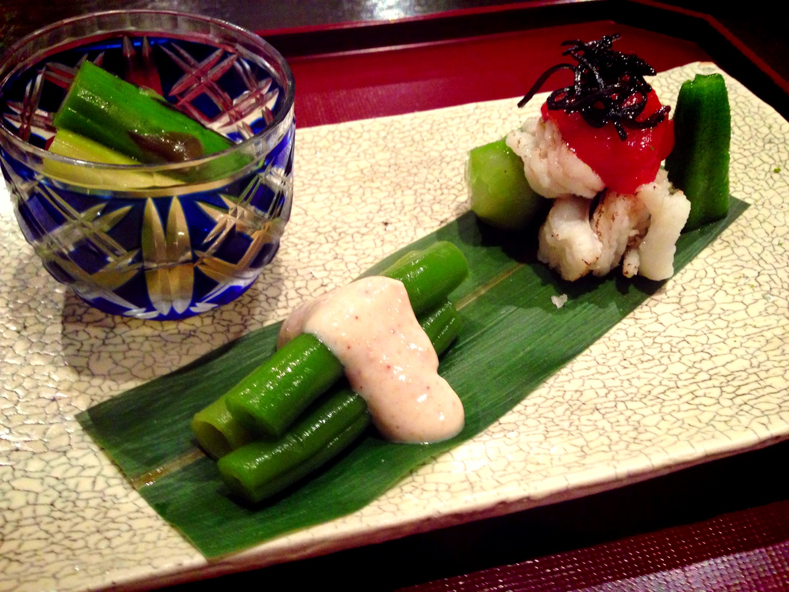 前菜 鱧にかかっているのは梅肉ではなくトマトの酢とのこと